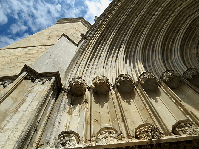 (Ampliar) - Perpectiva de la banda oest de la porta, amb les fornícules i les mènsules, i la torre del campanar.