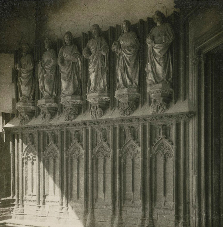 Durant la guerra del 1936, es van perdre deu de les dotze figures dels apòstols, per l'esmicolament de les figures en ser desplaçades per la Comissió de Patrimoni de la Generalitat de Catalunya. Actualment solament es conserven dues al cancell de les aules capitulars.