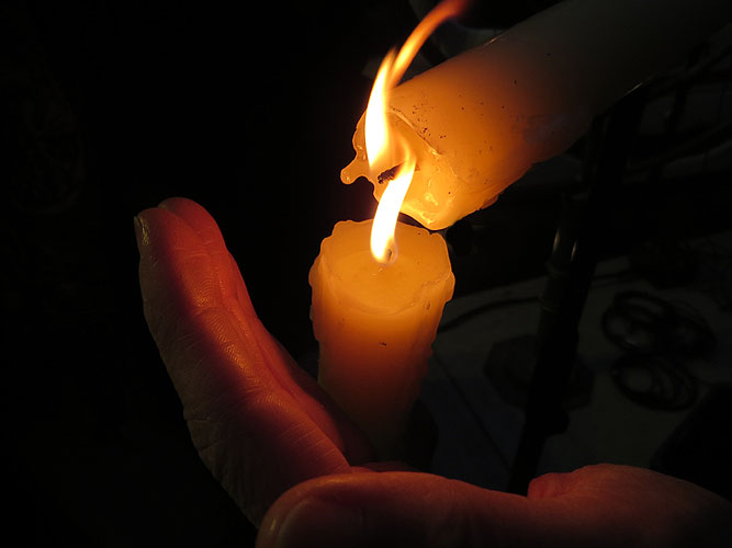 (Ampliar) - Encesa del xamaix, l'espelma testimoni amb la que s'encenen les altres vuit.