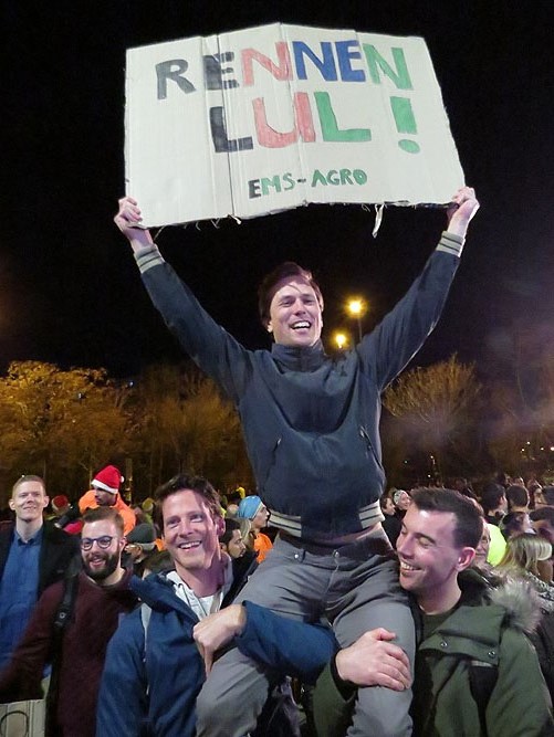 (Ampliar) - Amics de Gertjan Wassink, celebrant a la meta la seva segona posició.