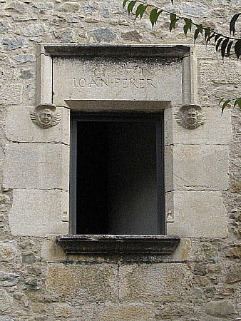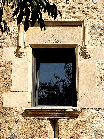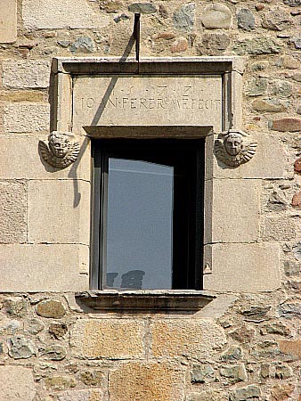 Les tres finestres amb angelets, i dues amb inscripcions, de la façana principal. |