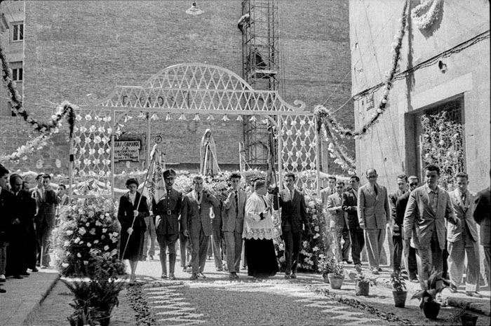 Processó de la Mare de Déu de Fàtima al seu pas pel carrer del Nord. 1951. Martí Massafont Costals. CRDI - Ajuntament de Girona - (Ampliar)
