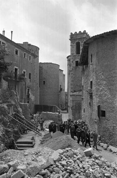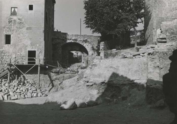 (Ampliar) - Inici de les obres del passeig Arqueològic al tram del carrer Ferran el Catòlic, davant els edificis de les Sarraïnes i els Banys Àrabs, 1959-1961. Autor desconegut. Ajuntament de Girona