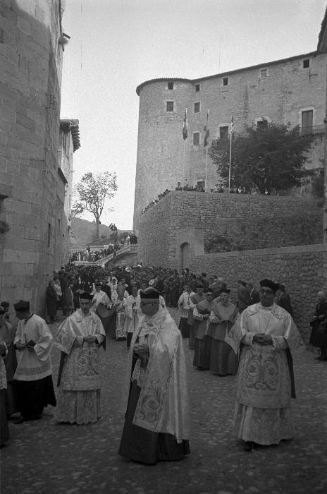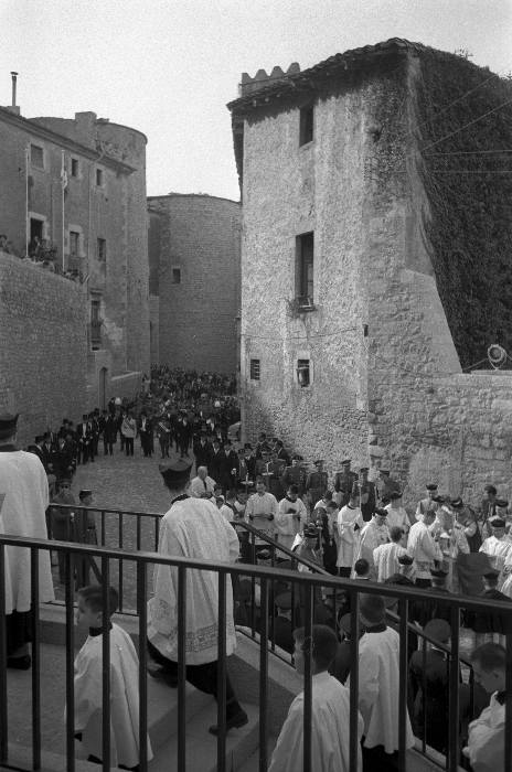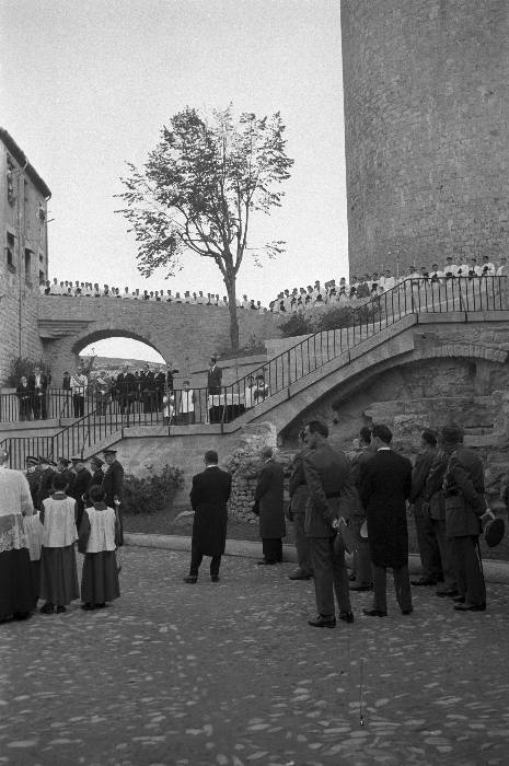 (Ampliar) - Inauguració de les obres d'accés al passeig Arqueològic al carrer Ferran el Catòlic. Benedicció a càrrec del bisbe Cartañà. Fotografia Fons Narcís Sans, Ajuntament de Girona