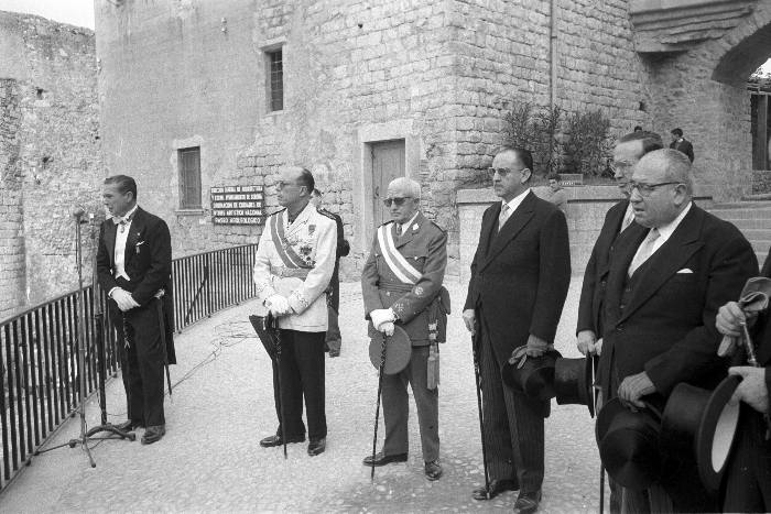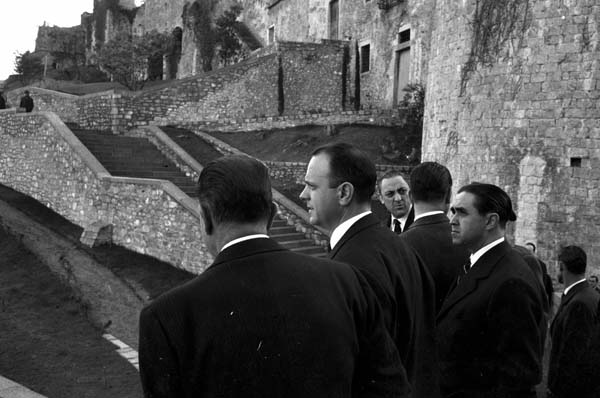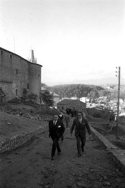 (Ampliar) - Visita del Ministre d'Informació i Turisme, Manuel Fraga Iribarne al passeig Arqueològic, el 1962, acompanyat del governador civil de Girona, Víctor Hellín Sol. Fotografia Fons Narcís Sans, Ajuntament de Girona