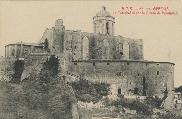 (Ampliar) - Cara nord de la Catedral de Girona vista des de la pujada de Montjuïc. En primer terme, el que seria el passeig Arqueològic i el recinte emmurallat, on destaquen la torre Júlia i la torre Cornèlia. Postal de 1900-1920. Col·lecció Ajuntament de Girona