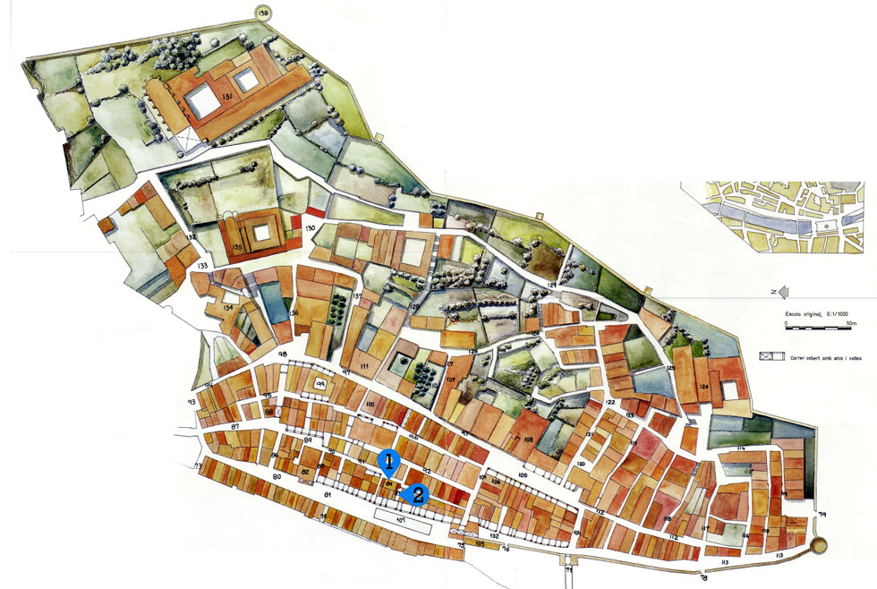 Plànol de l'Areny i la Vilanova, el sector meridional de la ciutat vella, entre la muntanya de les Pedreres i el riu Onyar, el 1535. S'hi indica: 1- Carnisserla de l'Ovella. Anomenada, també, de la Boqueria, documentada ja des de principis del segle XIII (1206), actual carrer de les Peixateries Velles. 2- Carrer de la carnisseria de l'Ovella. Travessia que anava a la plaça de les Cols, actual carrer de les Olles. Dibuix de Jordi Sagregra, publicat a "La ciutat de Girona l'any 1535" - (Ampliar)