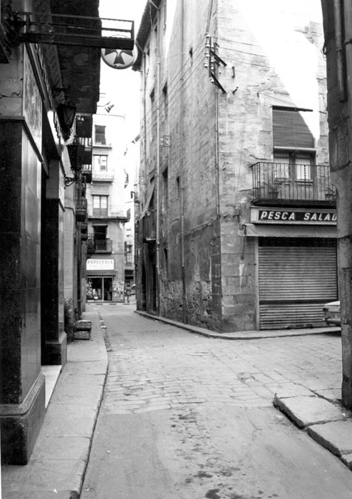(Ampliar) - El carrer de les Peixateries Velles. A la dreta, la plaça de les Castanyes. 1973. Autor desconegut. CRDI - Ajuntament de Girona.