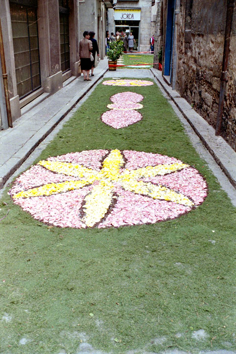 (Ampliar) - Catifes de flors al carrer de les Peixateries Velles amb motiu de la festivitat de Corpus. 1995. Juli Torres Monsó. CRDI - Ajuntament de Girona.
