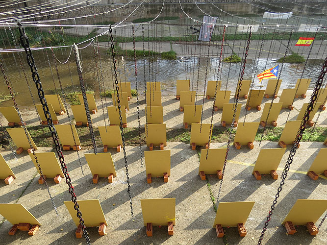 En una banda del riu s'hi varen col·locar banderes d'Espanya, porres policials, una corona i una imatge del rei Felip de Borbó de cap per avall. A l'altra banda, un "poble" amb desenes de figures sota un fons groc, les cares dels independentistes que estan a la presó o a l'exili, una falç groga de grans dimensions, pancartes on es llegeix "llibertat", "dignitat", "esperança" i "república", i 2.000 cadenes penjant.