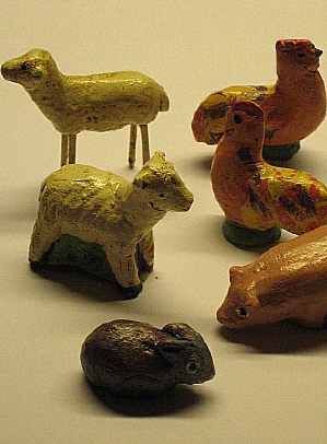Fotografies: caganer popular i animals de manufactura olotina. Caganer: alçada 50 mm. Col·lecció particular, Girona. Rei d'Orient anys 60. Col·lecció particular, Girona