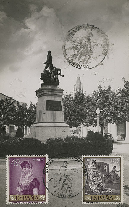 (Ampliar) - Postal de la plaça de la Independència. El matasegells reprodueix l'estàtua d'Álvarez de Castro. 1940. Sebastià Martí Roura. CRDI - Ajuntament de Girona.