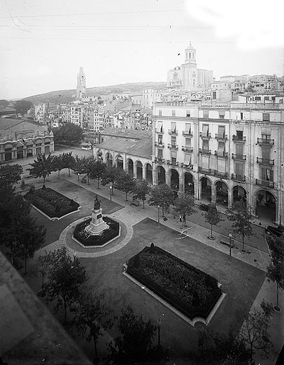 Vista parcial de la plaça de la Independència. Al centre, el monument als Defensors de Girona el 1808 i 1809. Al fons, el cinema Coliseu Imperial. 1909. Autor desconegut. CRDI - Ajuntament de Girona - (Ampliar)