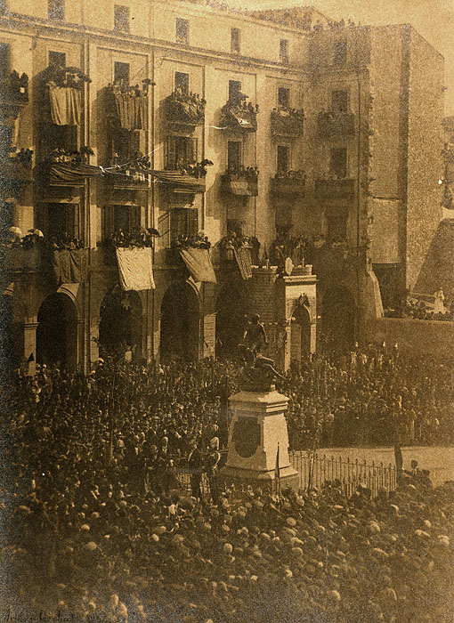 Inauguració del monument als defensors de Girona. Les autoritats encapçalades pel Capità General de Catalunya Valerià Weyler Nicolau i l'alcalde Francesc de Ciurana Hernández. Darrera l'escultura s'observa l'arc construit per l'ocasió. Els balcons estan decorats amb domassos. 1894. Artur Girbal Balandru. CRDI - Ajuntament de Girona - (Ampliar)