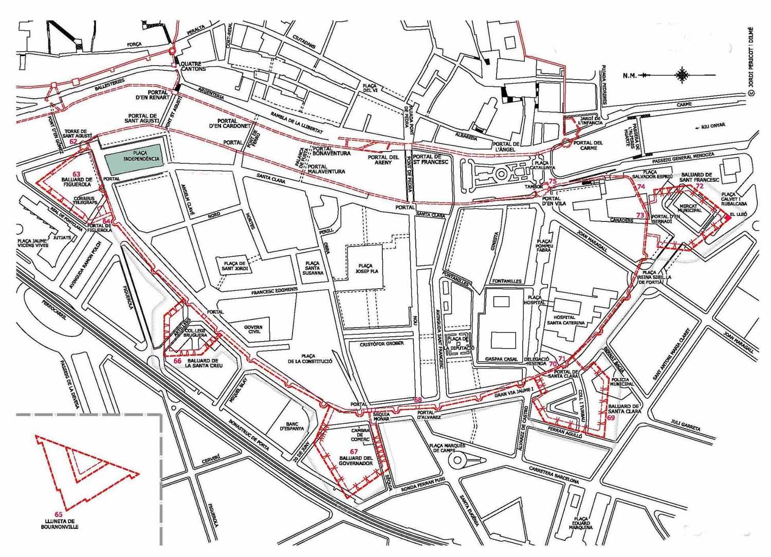 el baluard de Figuerola, on actualment s'alça l'edifici de Correus i també el baluard de la Santa Creu i una caserna militar d'infanteria i de cavalleria.