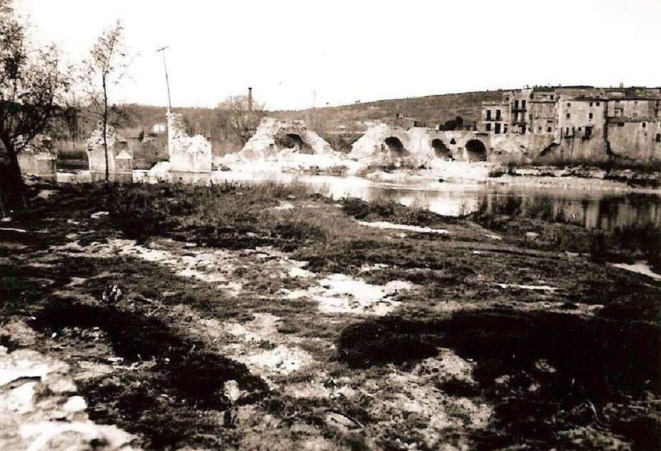 ![]() L'antic pont de l'Aigua, volat el 4 de febrer de 1939 pels soldats de l'exèrcit republicà en la seva retirada cap a Franç durant la Guerra Civil espanyola, estava situat en l'indret on la Via Augusta creauava el Ter. Documentat des del segle XIII, el pont de pedra medieval, testimoni de guerres i aiguats, va ser substituït per un de nova construcció, inaugurat el 4 de febrer de 1940, coincidint amb l'aniversari de l'entrada de les tropes franquistes a la ciutat. ![]() (Ampliar) - Vista del Pont Major amb les cases del barri al fons. En primer terme, el riu Ter. 1870-1880. Gravadors Jorizti i Mariezcurrena. Autor desconegut. CRDI - Ajuntament de Girona.