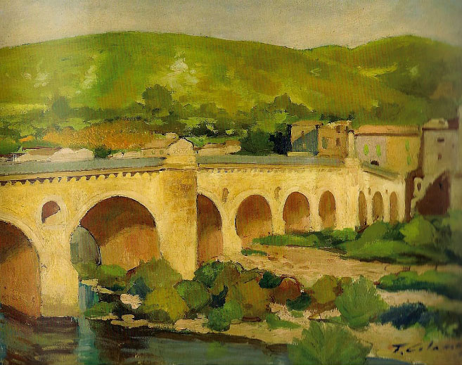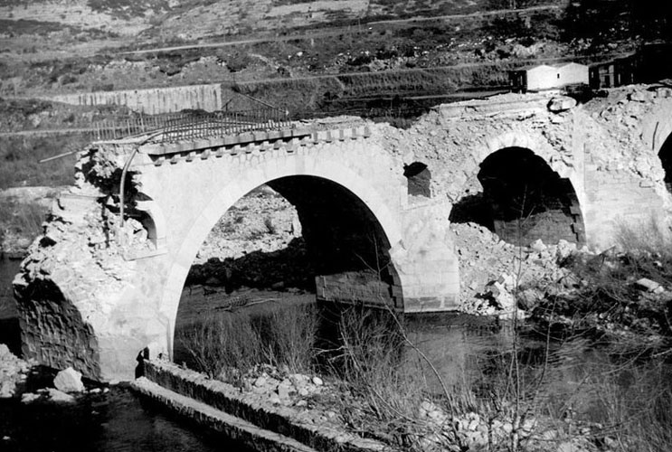 D'una manera o altra, el pont Major seguia en plena utilització. Durant les freqüents lluites de bàndols que afectaven també els gironins, fou precisament en passar pel pont, que Pere de Cardona, el 10 de juliol de 1514, fou atacat i greument ferit per un grup d'homes armats de ballestes i ganivets. Pogué encara rebre els auxilis espirituals, però morí mentre el traslladaven a Girona. ![]() (Ampliar) - Puente de piedra de Sarriá. Casa editorial Luis Coma, Barcelona , posteriorment desaparegut. 1896-1911. Autor desconegut. CRDI - Ajuntament de Girona.El problema que sovint presentava del pas insuficient d'aigua entre les seves arcuacions els dies de revinguda del Ter, se solucionà enfonsant 8 pams (1,60 metres) el sòl de la llera del riu a principis del segle XIX. Uns anys més tard, el 1831, el zelador de camins de Girona recomanà posar novament baranes a aquest pont (1). La última remodelació va ser l'any 1891. Era de 10 ulls i tenia una plataforma en punta de diamant al tercer ull per vèncer la força de l'aigua. El 24 de desembre de 1926 entrava en servei la línia del tren de Banyoles que passava pel pont. ![]() (Ampliar) - El Pont Major. Joan Colomer, 1930. Fundació Rafael Masó.L'actual, construït per presoners polítics sota la direcció dels enginyers militars de l'exèrcit franquista, és un pont de 8 ulls d'arcs de punt rodó. De caràcter monumental per les pilones, dues a banda i banda del pont, amb làpides commemoratives de la Guerra Civil. En el tram més proper a Sarrià, el pont puja en un pendent suau en els dos primers trams, per baixar al darrer en un pendent més pronunciat. Així, el pont consta de 3 parts caracteritzades per trossos massissos amb relleus al·lusius. La barana és de pilonets rodons amb motlluretes de mitja canya, seriats, amb passamà massís al damunt. El pont és damunt el Ter, i el terra de quitrà, sovint, deixa a la vista els carreus antics i les guies del tren de Banyoles. ![]() (Ampliar) - El pont de l'Aigua, mig enderrocat, al final de la Guerra Civil. Ca. 1939. CRDI - Ajuntament de Girona .![]() (Ampliar) - El pont de l'Aigua, després de la voladura provocada durant la retirada de l'exèrcit republicà. 1939. Autor desconegut. CRDI - Ajuntament de Girona .![]() (Ampliar) - L'antic pont de l'Aigua, sobre el riu Ter. A l'esquerra, Sarrià de Ter i a la dreta, el barri del Pont Major. 1877. Joan Martí. CRDI - Ajuntament de Girona.