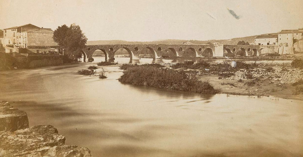 El primer de juny de 1423, també va alliberar dels drets de barra, pontatge, host i cavalcada tot el personal que dirigia la construcció del pont nou, així com els baciners o recaptadors dels mateixos drets (vuit a Girona i un a cada lloc de la diòcesi), tot concedint-los la protecció reial. ![]() (Ampliar) - El pont de l'Aigua sobre el riu Ter. Al fons, la població de Sarrià: de Ter. 1906-1918. Autor desconegut, fototípia Thomas. CRDI - Ajuntament de Girona.
