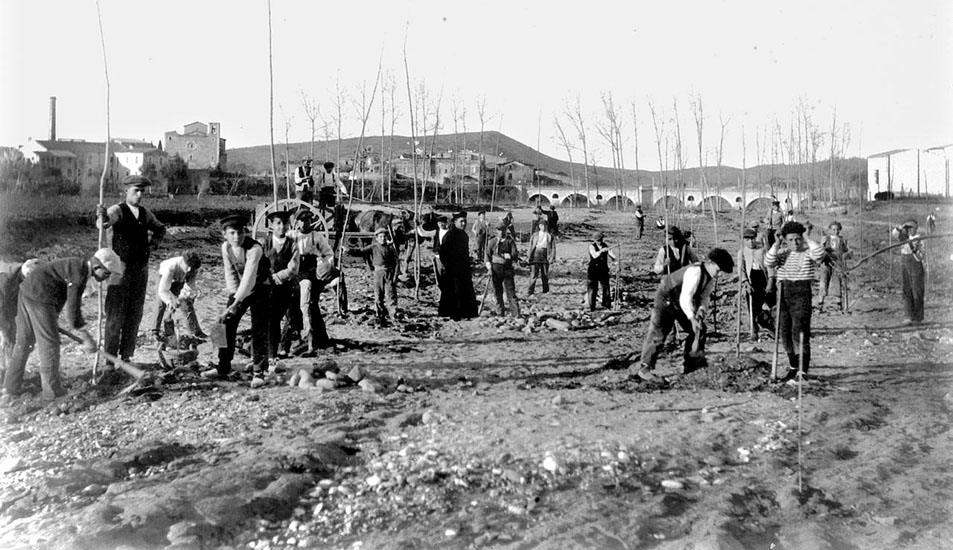 La confirmació de la reina Elionor d'Aragó, del 12 de maig de 1451, feia referència a uns capítols pensats per a la reparació del pont Major, que ja resultava antic i en perill d'enrunar-se. Ja feia temps que ella havia concedit la imposició del dret de pontatge, que duraria trenta anys. D'aquí n'havia sortit l'import de les despeses d'un nou pont que havien començat a poca distància del Major. Per això, en concedir el dret per trenta anys més, feia notar que cessaria el cobrament si abans s'acabava aquest nou pont. ![]() (Ampliar) - Alumnes de la granja-Escola de Sant Isidre netejant les terres de cultiu de l'escola després d'un aiguat, al barri de Pont Major. Al fons, d'esquerra a dreta, l'església parroquial de Sarrià de Ter i el pont de l'Aigua sobre el riu Ter. 1920-1930. Autor desconegut. CRDI - Ajuntament de Girona