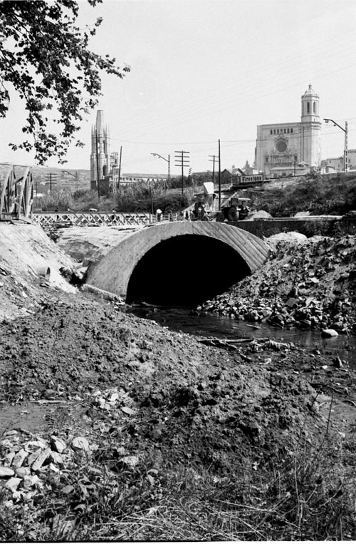 (Ampliar) - Obres de canalització del riu Güell a l'altura del pont del Rellotge a la Devesa. 1973. Josep Buil Mayral. CRDI - Ajuntament de Girona.