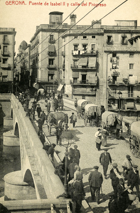 (Ampliar) - Vista des d'un punt enlairat del pont de Pedra i de l'Areny amb el mercat del bestiar boví. 1910. Josep Thomas Bigas. CRDI - Ajuntament de Girona.