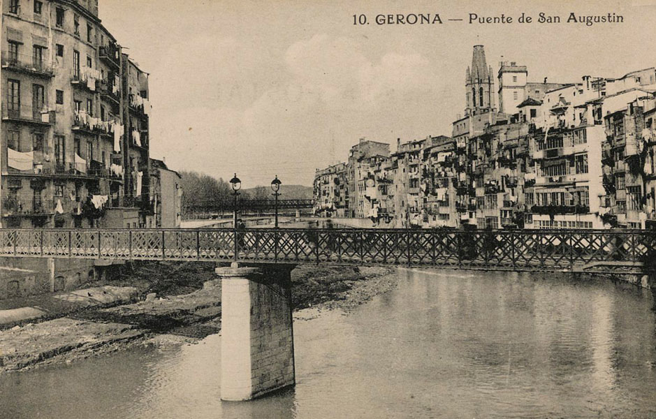 (Ampliar) - El pont de Sant Agustí sobre el riu Onyar. 1919-1930. Autor desconegut. CRDI - Ajuntament de Girona.1. Un pont de fusta. L'orígen d'aquest pont es remunta al 1647, quan l'Ajuntament, atenent una petició dels frares del convent de Sant Agustí, va construir una palanca de fusta sobre l'Onyar per tal que el convent disposés d'una via de comunicació amb l'Argenteria i els centres comercial i religiós de la ciutat. Després de l'aiguat del 13 de desembre de 1663 s'hi va construir un pont d'obra, al menys pel que fa als estreps i a un pilar central (1), que no va tenir una durada gaire llarga. Els anys 1830 i 1852 el pont tornava a ser de fusta.