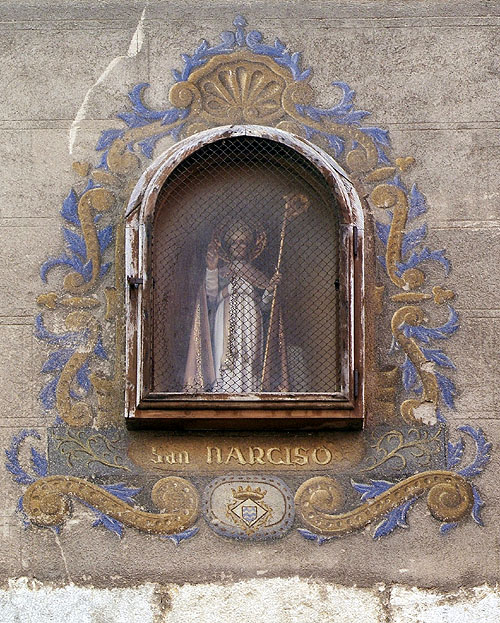 (Ampliar) - Fornícula amb la imatge de Sant Narcís, encastada al mur nord de l'església de Sant Feliu, al carrer Portal de la Barca. 2006. Jordi S. Carrera. CRDI - Ajuntament de Girona.