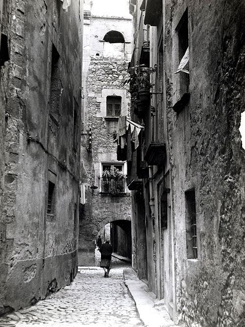Vista del carrer del Portal de la Barca amb un arc al fons. 1989. Lluís Cruset Ballart. CRDI - Ajuntament de Girona - (Ampliar)
