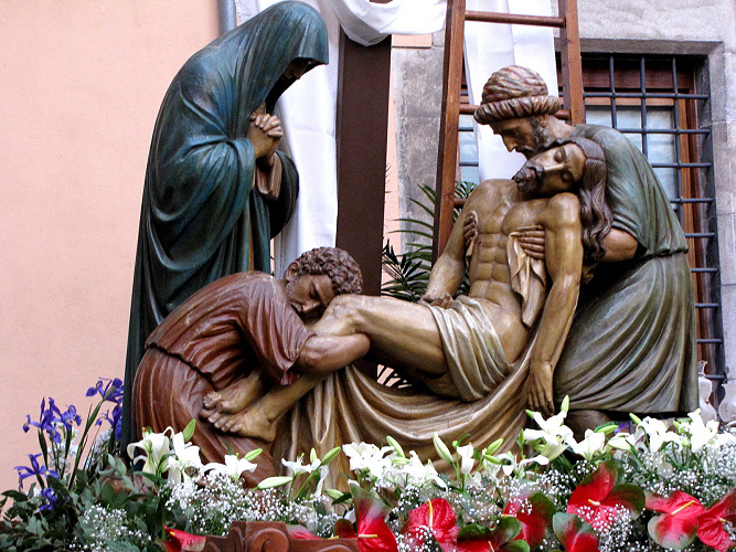 (Ampliar) - Pas de la caiguda de Jesús davant el Castrum de Sant LlucEl dramatisme que tenen els passos durant la processó del vespre, amb una il·luminació adient i acompanyats de les músiques que trenquen els silencis entre els que desfilen, queda desproveït durant el matí, a la llum del dia, fent les figures més properes, humanitzant les les seves actituts i expressions, des de l'alegria dels nens que reben Jesús a la seva entrada a Jerusalem el diumenge de Rams, fins la tristor i recolliment dels àngels que porten el sant sepulcre damunt els seus muscles. Els visitants avisats que acull la ciutat aquests dies de Setmana Santa fan cap a la plaça de la Catedral per contemplar, en un moment únic a l'any, aquesta activitat d'ornament i contemplar els passos de ben a prop, tant des de la mateixa esplanada amb la façana de la seu gironina de teló de fons, com també amb la perspectiva que dóna veure´ls des de l'escalinata de la catedral. |