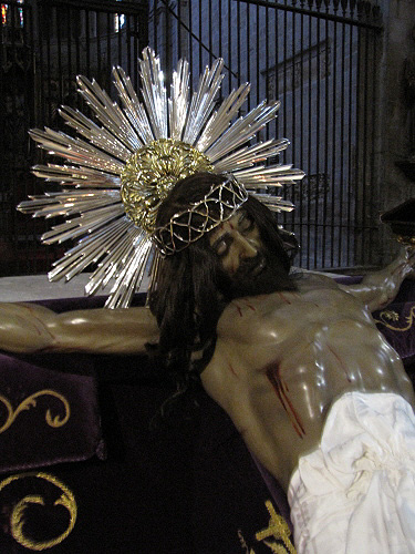 (Ampliar) - El Crist de la Confraria de la Passió i Mort de Nostre Senyor Jesucrist, a l'església de Sant Feliu, abans de sortir en processó.