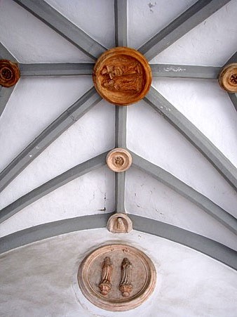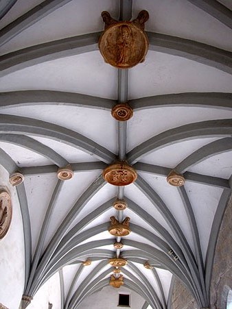 ![]() La situació extramurs de l'antic burg de Sant Pere, ha fet que el monestir de Sant Daniel hagi patit nombrosos maltractaments durant les diverses guerres en què s'ha vist implicada la ciutat de Girona. Malgrat aquestes agressions, conserva quasi íntegrament l'església, la torra i el claustre aixecats durant la segona meitat del segle XII i començaments del segle XIII. A partir d'aquests elements arquitectònics, s'han bastit al llarg del segles diverses edificacions per anar-lo adaptant a les necessitats de reparació i utilització com a monestir de monges benedictí. ![]() (Ampliar) - Els "dos" claustres del monestir de Sant Daniel. A la dreta, l'escala de comunicació entre les galeries baixes (Segle XIII) i les galeries superiors (1427-1430).Referències reculades fins al segle XV esmenten que l'abadessa Ermessenda (1424-1427...), d'igual nom que la comtessa fundadora del monestir cap el 1020, emprengué importants obres de reforma i ampliació, les quals afectaren substancialment el dormitori. L'any 1427, Dalmau de Raset, ardiaca major de la diòcesi de Girona, es reuní a Sant Daniel amb l'abadessa i el capítol del convent per a tractar diverses qüestions referents a l'estat de conservació en que es trobaven les dependències del monestir i també de la seva possible ampliaciió. ![]() (Ampliar) - Voltes de creueria de la galeria superior Nord (1427-1430).