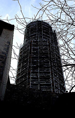 A finals del segle XIII, l'any 1293 es preveien fer obres a l'església, possiblement de reparació de l'edifici romànic afectat pel setge de Felip l'Ardit. A partir del 1309 es treballa en la construcció de l'església; entre 1315 i 1321 es treballa en l'àbsis. Les dades del 1348 fan referència a la millora de l'escala d'accés al temple, escala que unia l'areny de l'Onyar amb la plataforma on es construí el temple. Aquestes obres foren encarregades al mestre Pere de Capmagre pel senyor d'Escalde; a principis del 1349 també apareixen referenciats els mestres picapedrers Jaume Lempayes i Pere Nicolau Sanç. El 1346 es seguía treballant en l'escala i el 1349 es començaren les obres a l'interior de l'església i a la llotja, on arribaven les pedres escairades i se les acabava de donar forma. Les obres del segle XV-XVII. A finals del segle XV es va procedir a ampliar l'església, ampliació que va consistir en la construcció d'un nou tram de volta i l'aixecament de la façana principal. Aquestes obres les va dur a terme el mestre d'obres Julià Julià, mestre major de la Seu gironina. Acabada l'ampliació, es va procedir a finalitzar el campanar(4). La forma actual d'aquest, amb l'agulla truncada, tot i que diverses ho atribueixen a la caiguda d'un llamp, com Josep Mercader que parla de la caiguda del llamp el 9 de gener de 1581, Jaume Marquès el 9 de gener de 1678, Joaquim Fàbregas el 9 de gener de 1651 i les actes capitulars de la Catedral esmenten la data de 9 de gener de 1581, té una causa més prosaica: un error de disseny. Francesc Llorenç i Chamorro ("Els campanars gòtics a les comarques gironines", Diputació de Girona) diuen que per l'estudi exhaustiu que s'ha realitzat d'aquest campanar, segons el nostre punt de vista, va ser acabat com és ara. El van deixar així perquè no sabien con acabar-lo a causa de les irregularitats de la base de l'agulla o per falta de recursos econòmics per finançar l'obra. Posteriorment s'ha localitzat la traça que confirma l'error en la regularitat de l'octògon base. Notes