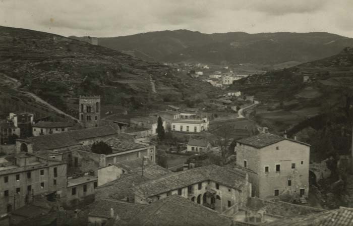 (Ampliar) - Vista del barri de Sant Pere de Galligants i la vall de Sant Daniel des del campanar de l'església de Sant Feliu. En primer terme a la dreta, els Banys Àrabs i la casa de les Sarraïnes. Principis segle XX. Autor desconegut. CRDI - Ajuntament de Girona.