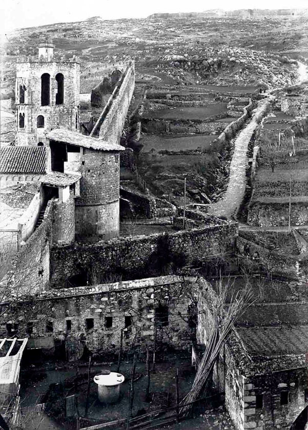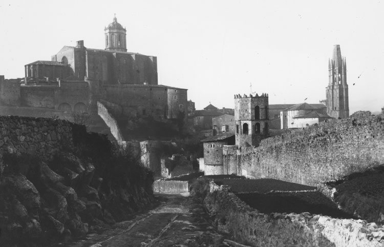 (Ampliar) - El monestir de Sant Pere de Galligants i el tram de muralla que enfila cap a la muntanya de Montjuïc. En primer terme, les restes del baluard de Sarraïnes, i al centre, el Tambor de Sant Daniel, que protegia el portal. Darrere el monestir, la torre de la capella de Santa Llúcia, i a la dreta, el camí vell de Montjuïc. 1910. Autor desconegut. CRDI - Ajuntament de Girona