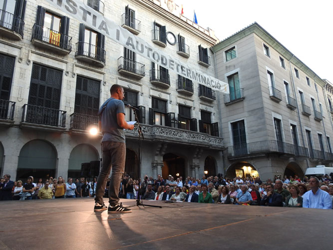 (Ampliar) - La plaça del Vi durant l'acte. Varen intervenir per videoconferència, presentat per Sergi Font, president d'Òmnium Gironès, Marta Rovira, secretària general d’Esquerra Republicana; Anna Gabriel, ex-diputada de la CUP; el cantant Valtonyc; l'ex-conseller Lluís Puig i Gordi; el diputat al Parlament Europeu Toni Comín i Oliveres, l'ex-conseller Raül Romeva i Rueda, l'ex-presidenta del Parlament de Catalunya Carme Forcadell i Lluís, el president d'Esquerra Republicana de Catalunya Oriol Junqueras i Vies i el MHP de la Generalitat Carles Puigdemont i Casamajó, entre altres.