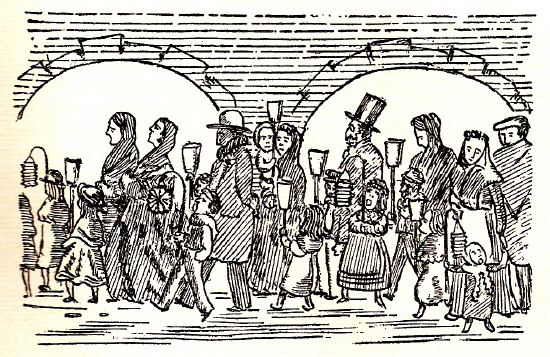 La Rambla presentava un aspecte magnífic, sobretot en la seva part alta. Centenars i centenars de fanalets de tots colors oscil·laven en la foscor en un vaivé continuat, formant un animat mosaic multicolor, una veritable riuada de llum policroma que girava i creixia per l'afluència dels qui anaven arribant pels carrers que hi abocaven, al mateix temps que augmentava la intensitat dels cants que incansablement repetien la vella cançó popular. Cap allà a les set o quarts de vuit, que el fred era més viu, com que la gent menuda acostumava a estar cansada, començaven a retirar-se per all`on vingueren. De mica en mica els carrers s'anaven buidant. Havia arribat el moment àlgid de les il·lusions, dels remordiments ingenus i dels penediments sincers. Corpresos per l'emoció que fins els feia perdre les ganes de sopar, anaven els menuts a posar un plat al balcó o a la finestra i, per si de cas, un cistell o una panera, no mancant els qui per congraciar-se amb les Reials Majestats també hi posaven una mica de palla, un grapat de garrofes o un pot d'aigua per a llurs cavalcadures. Als més entossudits en la pretensió de voler veure la comitiva reial se'ls amenaçava dient-los que els Reis, que tot ho saben, deixaven sense joguines els nens tafaners. Era un risc que cap infant no gossava afrontar. I quan el món infantil dormia en l'esperança i somniava carrils, timbals i nines, les quincalleries de la ciutat s'omplien a vessar de reis i reines que anaven a proveir-se copiosament per tal de convertir en realitats les il·lusions de llurs innocents fillets. Notes Font: "Girona, petita història de la ciutat i de les seves tradicions i folklore". J. Gibert. Barcelona, 1946. |