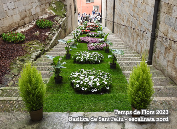 Del dissabte 13 al diumenge 21 de maig 2023 s'ha celebrat la 68ena. edició de l'esdeveniment "Girona Temps de Flors", una setmana durant la qual els projectes florals omplen de color i creativitat els principals monuments de la ciutat. A l'escalinata nord de la Basílica de Sant Feliu s'hi mostra la instal·lació "El jardíí de les delícies", de Maria Rosa Corredor Viñas, Carme Albareda, Imma Arango, Kati Bota, Mercè Brea, Olga Brea, Carmen Bussó, Mercè Cla, Pilar Iborra, Rosa Maria Poch i Neus Pons.