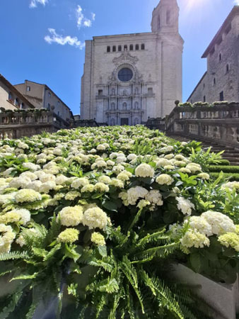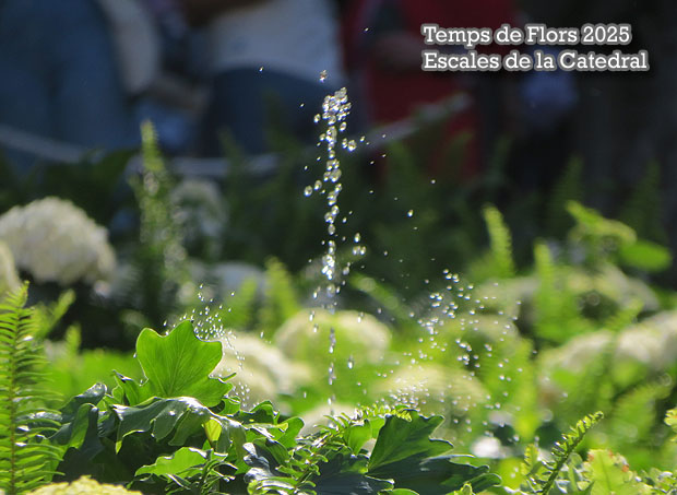 Flors i aigua brollant de la catedral. Enguany les escales de la catedral simbolitzen una cascada de flors i d’aigua. Un projecte liderat per Anna Maria Figa, Margarita Pla i Carolina Rodríguez, amb la participació dels membres de l’Associació Amics de les Flors i col·laboració de les brigades municipals. Ambdues entitats uneixen mans i esperit per celebrar 70 anys de Temps de Flors. Associació Amics de les Flors de Girona i brigades municipals de l’Ajuntament de Girona.