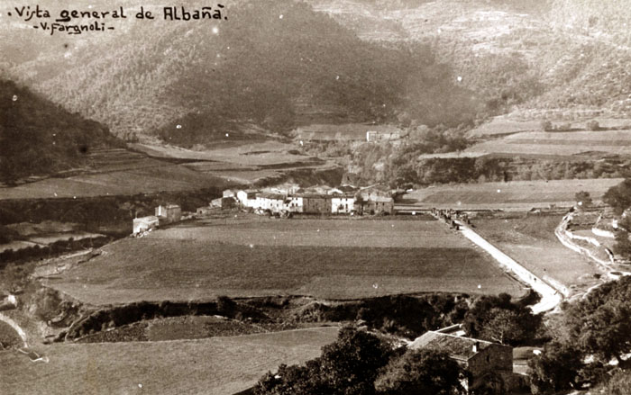 Albanyà Història de Albanyà. Els primers vestigis. La zona del municipi és habitada des de temps prehistòrics, com ho demostren diferents vestigis arqueològics, com ara el jaciment de la Cova de la Pólvora, amb ocupació des del Neolític (entre 3200 i 3320 aC) fins a finals de l'Edat de Bronze, amb una cronologia aproximada de 800 a 1000 aC, i la tomba megalítica o cista de la Creu de Principi, de forma pentagonal, formada per cinc lloses calcàries, tomba que estava coberta per un túmul de terra amb una anella circular de grans pedres encerclant l'estança, de més de 7 metres de diàmetre. Aquesta tomba, per la seva arquitectura, es pot datar del Neolític final (3500 - 2700 aC), en base a les troballes de materials ceràmiques. ![]() Vista general d'Albanyà. 1911. Valentí Fargnoli i Annetta. CRDI - Ajuntament de Girona. - (Ampliar)