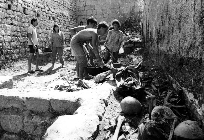 La població té el seu origen en el monestir benedictí de Sant Pere d’Albanyà, referenciat en un document de Carles el Calb del 844, que va ser fundat per l’abat Dòmnul en 820-25; en aquesta data ja posseïa les cel·les de Sant Romà de Casamor i de Sant Miquel de la Cirera (de Cabanelles) i els “villares Albanianum scilicet et Buscariolas”, aquest darrer és avui un lloc deshabitat del terme d’Albanyà. Perdurà poc temps com a monestir independent: el 869, en un precepte del rei Carles el Calb, ja figura, amb les cel·les esmentades i la vila i terme d’Albanyà, com a possessió del monestir d’Arles, al Vallespir, dependència confirmada el 878, on s’esmenten entre altres els llocs d’Ortos i Carbonilles, que corresponen als Horts i a Carbonils, i també el 881. Malgrat això continuà gaudint d’una certa importància, i el 957, el bisbe de Girona Arnulf, a petició de l’abat d’Arles, consagrà el temple d’Albanyà, amb tres altars dedicats a Santa Maria, sant Pere i sant Pau. El 1078 Arles passà a dependre de Moissac. Albanyà figura com a parròquia des del segle XIII. La jurisdicció senyorial va ser dels vescomtes de Rocabertí i, a la fi del segle XVII, formava part, per tant, del comtat de Peralada. ![]() Camp de treball al monestir de Sant Llorenç de Sous. 1986. Joan Segur. CRDI - Ajuntament de Girona. - (Ampliar) Carbonils. L’antiga parròquia de Carbonils és esmentada el 878 i l’església el 1279. La decadència de la producció de carbó vegetal, activitat relacionada molt probablement amb el topònim i mitjà de vida bàsic d’aquesta zona, va provocar el seu despoblament; el 1970 encara hi restaven 13 habitants, xifra que el 1996 es reduí a 1. L’església de Sant Feliu de Carbonils és romànica i al costat hi ha elements de l’anterior, preromànica. A la sagristia d’Albanyà es conserva una làpida sepulcral esculpida d’època gòtica primitiva, que en procedeix. El santuari de la Mare de Déu del Fau. Conegut també pel santuari de les Formigues o de les Alades, ja que és creença popular que el dia de la Mare de Déu de Setembre hi van a morir, per milers, les formigues alades. És un petit temple d’una nau i absis semicircular del segle XV, exemple clar de la perduració, en èpoques tardanes, de les formes romàniques dins l’arquitectura religiosa popular. És ben documentada la construcció del santuari a partir del 1407, substituint-ne un d’anterior. Els Horts. L’antiga parròquia de Sant Cristòfol dels Horts és esmentada el 878, i el 954 (Sancti Christophori de Ortis); el 990 consta com un alou del monestir de Sant Pere de Rodes. Actualment l’església de Sant Cristòfol dels Horts és molt arruïnada; resta dreta part de l’única nau i l’absis semicircular. Era un edifici bastit en dues èpoques, però la major part és dels segles XII i XIII. Al proper Mas dels Horts es conserva una talla de la Mare de Déu romànica, molt rústega, que en procedeix.