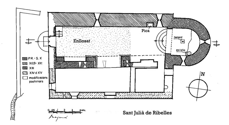 Fundació del monestir de Sant Llorenç del Mont o de Sous, és un dels centres més vius de devoció no solament de l’Alt Empordà sinó també de les comarques veïnes de la Garrotxa i el Pla de l’Estany. Gaudeix d’una magnífica vista panoràmica sobre les tres comarques i sobre els Pirineus; és tradició que Jacint Verdaguer, que hi passà l’estiu del 1884, s’inspirà aquí per al seu poema "Canigó". ![]() Planta de Sant Julià de Ribelles. GESEART, publicat a "La cista amb túmul de la Creu de Principi..." (op-cit) - (Ampliar)