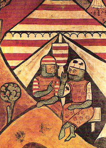 Hug IV, comte d'Empúries, a l'esquerra, i Pero Maça de Sangarrén durant la Croada contra Al-MAyurqa, el 1229. Viquipèdia - (Ampliar)