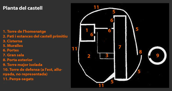 Al punt més alt i al caire dels cingles s'alça la torre de l'homenatge, de planta quadrangular, de 8 metres de costat i conservada uns 6 metres d'alçada. Al sector inferior s'hi observa una aparell de pedres desbastades, escairades a manera de petits carreus molt rudimentaris que s'arrengleren amb carreus grossos de cantonada. A llevant de la torre, una esplanada limitada pels cingles i les altres construccions. Al sòl, fonaments d'antigues edificacions. Una gran cisterna coberta amb volta de canó que ha conservat l'arrebossat interior i emprentes de les llates de fusta utilitzades per construir-la. A l'extrem de tramuntana hi ha una construcció rectangular molt gran dins la qual, a migdia, resten les arrencades d'uns arcs diafragmàtics.