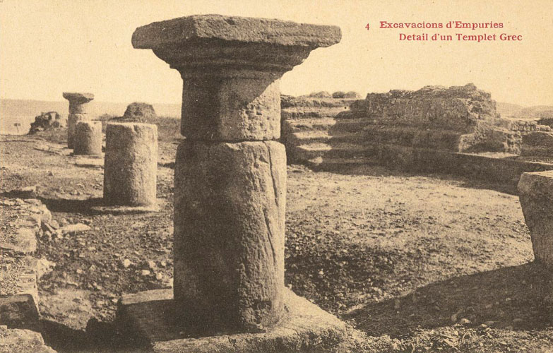 Aquest nucli controlava el port fluvial i es completava amb petits nuclis rurals de l’entorn proper, com Santa Margarida, Santa Magdalena i Sant Vicenç, cadascun d’ells amb la seva església i el seu cementiri. Algunes d’aquestes esglesioles medievals s’aixecaren sobre restes de construccions anteriors d’època tardoromana, que coincideixen cronològicament amb noves àrees d’enterrament, com la localitzada al sector nord de la ciutat grega. La Necròpoli descoberta a la zona meridional de la ciutat d’Emporion, entre l’àgora i el port, tenia prop de 500 tombes i una petita capella (cella memoriae) construïda sobre un antic edifici termal. ![]() Excavacions d'Empúries. 1920-1925. Autor desconegut. CRDI - Ajuntament de Girona.. - (Ampliar) Les excavacions.