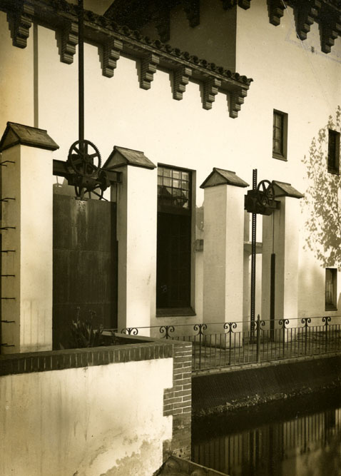 Maquinària de la central hidroelèctrica i el salt d'aigua d'Arenys d'Empordà. 1920. Fotografia Unal. CRDI - Ajuntament de Girona - (Ampliar)