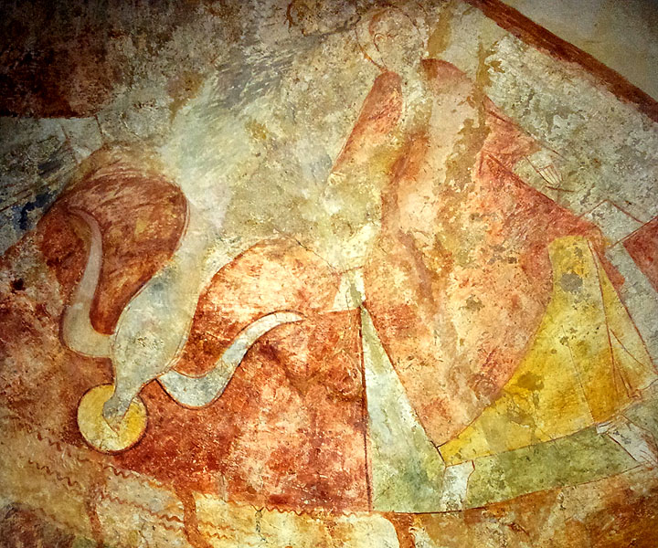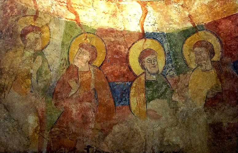 L'absis est` decorat amb pintures murals romàniques del segle XII, atribuïdes al cercle del Mestre d'Osormort. Es poden veure alguns fragments in situ, però la major part s'exhibeixen al Museu d'Art de Girona. Representen la Pentecosta i la Santíssima Trinitat. ![]() Església de Sant Joan de Bellcaire. A la dreta s'observa una columneta estriada d'un altar d'època romana reaprofitada per a la construcció de l'absis - (Ampliar) Les pintures de Bellcaire van ser trobades en la primera restauració de l'edifici entre el 1927 i el 1931, quan es va desmuntar el retaule barroc que tancava el semicercle absidal. Uns quants anys més tard, entre el 1932 i el 1934, els frescos van ser arrencats, traspassats a un suport i emmarcats. Del conjunt, avui només es conserven les pintures de la volta i les del primer registre del mur semicircular, que, en haver estat arrencades i traslladades sobre tela , han perdut la seva forma semicircular. En el Museu d'Art no s'hi troben totes les pintures conservades, ja que hi manquen dues figures d'apòstols que formen part de la col·lecció particular d'Antoni Batlló, a Barcelona. ![]() Pentecosta. Detall de la pintura mural del mestre d'Osomort, del segle XII, procedent de l'església de Sant Joan de Bellcaire. Actualment s'exhibeix al Museu d'Art de Girona. Estava pintada al mur del temple amb la tècnica de pigments aglutinats amb calç viva. - (Ampliar) A la part de la volta de l'absis hi ha representada la Trinitat: en el centre, l'Esperit Sant en forma de colom blanc nimbat; al costat dret, una figura asseguda i amb aurèola,que ocupa tota l'alçària disponible del lateral de la volta,i que l'aplanament de les pintures deforma de manera considerable. Cal suposar que una tercera figura ocupava l'espai restant a l'esquerra. Les figures de la Trinitat estan separades del registre inferior per mitjà d'un fris o sanefa composta per una successió de línies vermelles ondulades, sobre un fons blanc. Els motius de la sanefa són travessats per les llengües de foc irradiades pel colom de l'Esperit Sant que cauen damunt dels apòstols. ![]() Pentecosta. Detall de la pintura mural del mestre d'Osomort, del segle XII, procedent de l'església de Sant Joan de Bellcaire. Actualment s'exhibeix al Museu d'Art de Girona. Estava pintada al mur del temple amb la tècnica de pigments aglutinats amb calç viva. - (Ampliar)