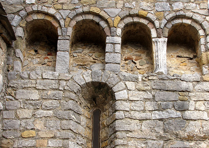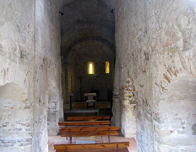 Bellcaire d'Empordà Església de Sant Joan de Bedenga (Bellcaire) L'origen de l'antic edifici cal situar-lo cap als segles V-VI. Inicialment era un antic mausoleu d'un personatge important i pertanyia al bisbat de La Bisbal. L'església, declarada Monument Històric Artístic nacional, s'anomena per primera vegada amb el nom de Sant Joan in Bedenga (1), en una butlla del papa Silvestre II de l'any 1002, en la que confirma la seva possessió per la Catedral de Girona. ![]() Absis de l'església de Sant Joan de Bellcaire - (Ampliar) L'edifici. Les reformes dels segle VII o VII sobre la primitiva construcció van afegir un absis i es va convertir en l'església parroquial. La transformació més important és d'època carolíngia, al segle X, com a església preroànica, una de les més destacades de Catalunya. Es varen construir les tres naus actuals, cobertes de voltes i comunicades per arcs de ferradura sobre pilars. Al segle XI es va afegir l'absis romànic amb decoració llombarda. ![]() Església de Sant Joan de Bellcaire - (Ampliar) La planta correspon a una construcció basilical de tres naus, la central coberta amb volta de canó i les laterals amb voltes de quart de cercle. Es comuniquen mitjançant dos arcs de ferradura a cada costat sostinguts per pilars. L'absis és semicircular amb volta de quart d'esfera i creuer. Aquest i les naus són d'època preromànica (segles IX-X), com també una absidiola de ferradura visible al costat nord, entre l'absis i el braç del creuer. ![]() Església de Sant Joan de Bellcaire - (Ampliar) Les pintures murals.