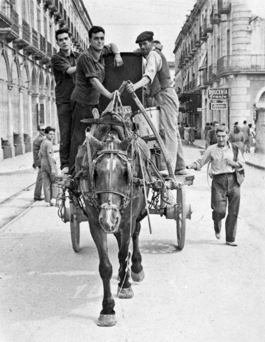 Els traginers Paulí Font, Pere Font i Joan Dalfó, traslladant els instruments musicals d'una banda que actuà a la Festa Major. 1940. Arxiu Comarcal del Baix Empordà - (Ampliar)