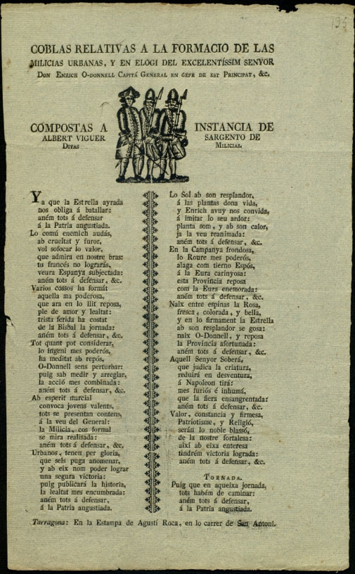 Coblas relativas a la formació de las milícias urbanas, y en elogi del excelentíssim senyor Don Enrich O-Donnell. Ca. 1810. Generalitat de Catalunya - (Ampliar)