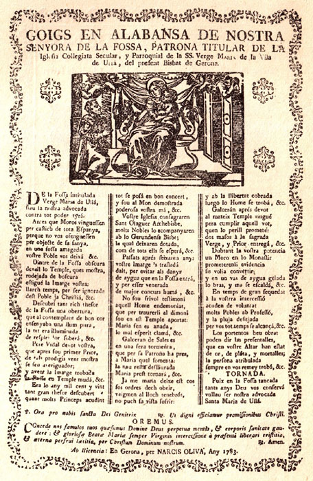 Notes (2) L'any 1325 tres clergues de la canònica, Bernat Huguet, Berenguer Huguet i Marc des Puig, per Setmana Santa van representar el drama litúrgic de la visita de les tres Maries al Sant Sepulcre, De Tribus Mariis. Els tres religiosos es van caracteritzar de les tres dones i devien oferir una versió teatral poc decorosa o pujada de to. La batllessa d'Ullà, Isabel Sebèllia, molt ofesa, va escriure una carta per denunciar els fets al bisbe de Girona. Aquest, enfurismat, manà detenir-los i els imposà una garantia molt elevada, de mil sous a cadascun. - (Tornar al text) (Imatges base capçalera: Viquipèdia) |